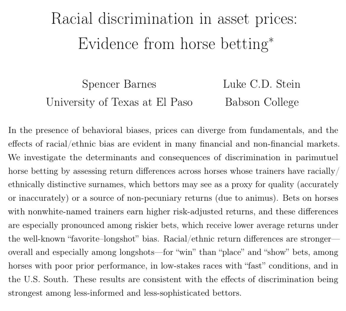 🧑🏾🐎🧑🏽🐎🧑🏼🐎 New: “Racial discrimination in asset prices: Evidence from horse betting” w/ @SpencerBarnes99 If gamblers underestimate minority trainers (or just don’t 𝘭𝘪𝘬𝘦 them), their horses may generate higher risk-adjusted returns! Download WP lukeste.in/horsebetting 1/7