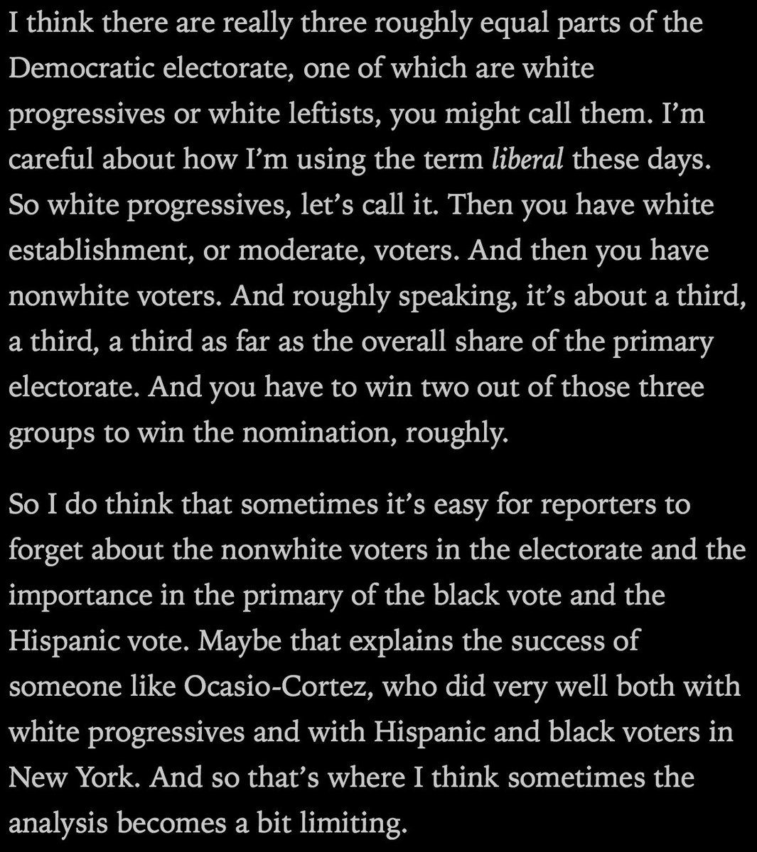 .@NateSilver538 characterizes the math of the Democratic electorate in Slate interview as ~⅓+⅓+⅓ (white progressive, white centrist, non-white). A nice rule of thumb to keep in mind. Anyone suggest an analogous way of thinking about Republicans?