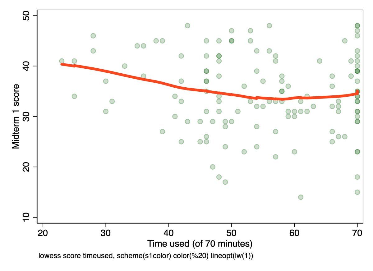 I’ve never thought much carefully about exam design, but thinking I’ll show them this plot of time used vs. score.