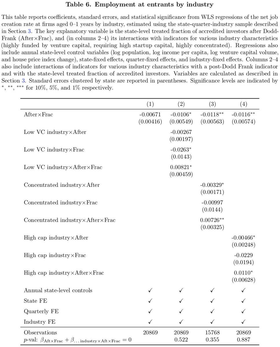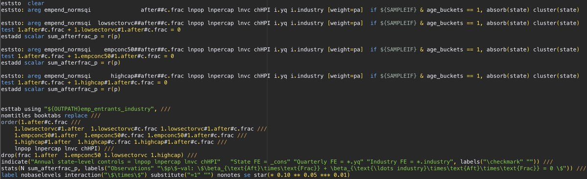 @causalinf OK, here's one back at'cha (from my WP with Laura Lindsey on angel investment). Two particularly nice estout features: 1. Handling factor variables e.g.. with interaction("\$\times\$") and indicate(…, labels("\checkmark" "")) 2. Reporting auxiliaries (here p. val on a test)