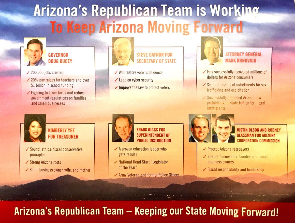 Thanks to the AZ Republican Party for pointing out in mailer that your only featured non-white candidate has “strong Arizona roots”; a “wife and mother,” she’s also only featured female candidate. Needless to say no allusion to other six candidates’ origins, spouses, kids.