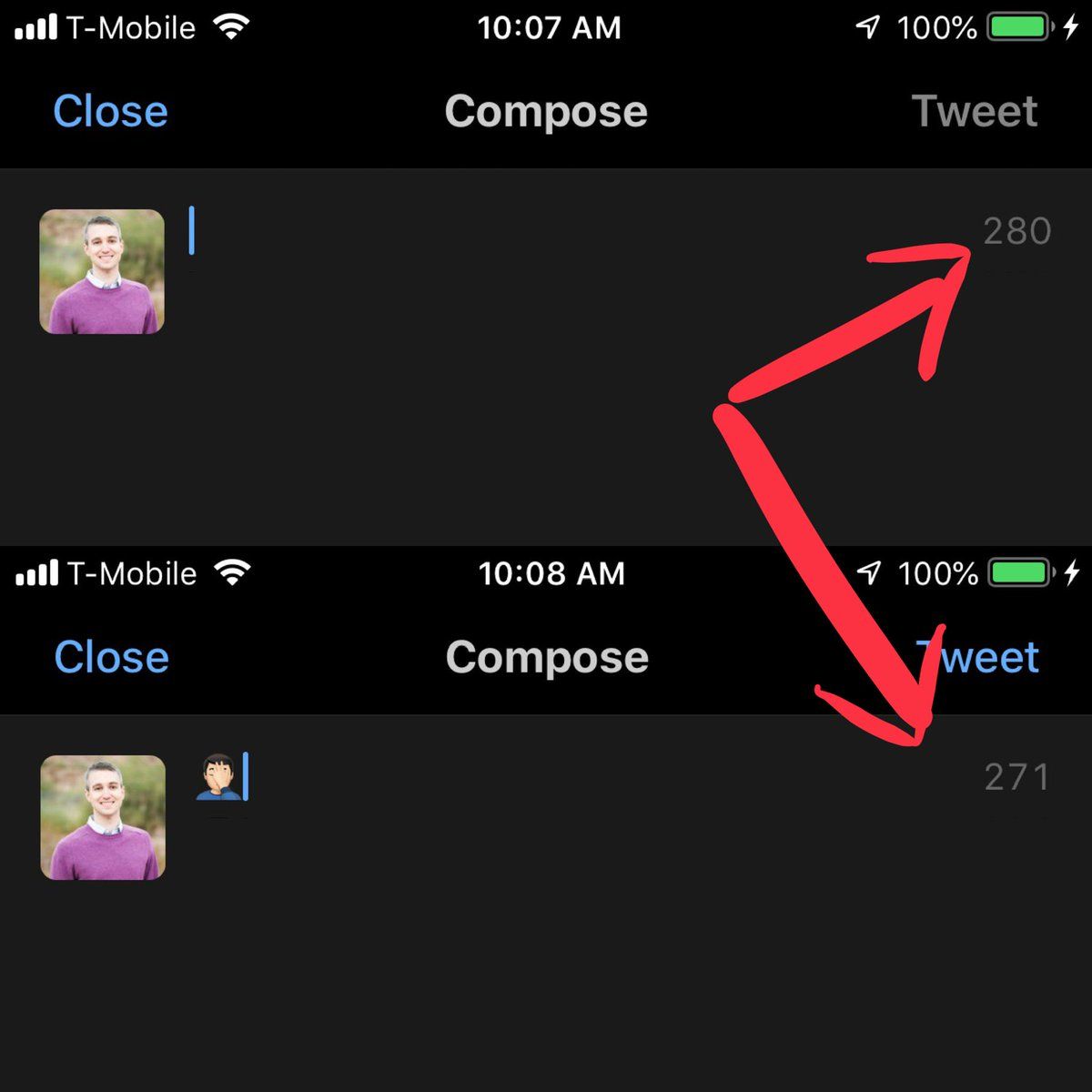 TIL that Twitter counts my favorite emoji (“light-skinned man smacking myself in the face”) as NINE CHARACTERS! 🤦🏻♂️