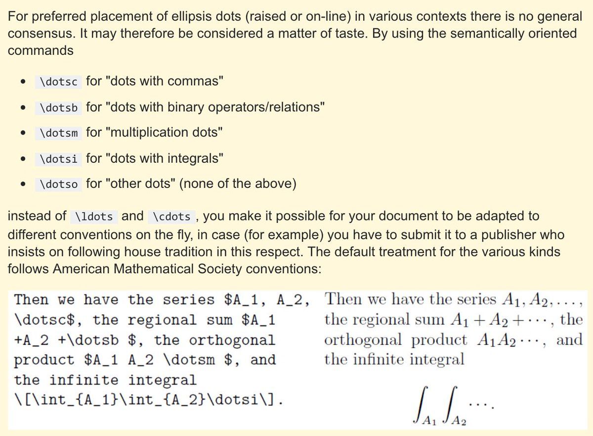 Take your TeX dots to the next level with correct horizontal spacing: • \dotsc for commas • \dotsb for binary operators/relations • \dotsm for multiplication • \dotsi for integrals [screenshot from tex.stackexchange.com/questions/122491/difference-of-the-dots ] @TeXtip/1062370843915886592