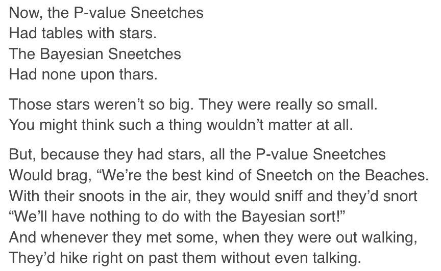 “Now, the P-value Sneetches Had tables with stars. The Bayesian Sneetches Had none upon thars.” Andrew Gelman brings it andrewgelman.com/2018/12/06/parable-regarding-changing-standards-presentation-statistical-evidence/