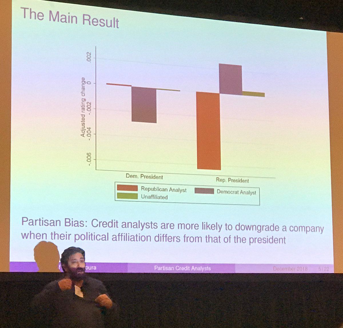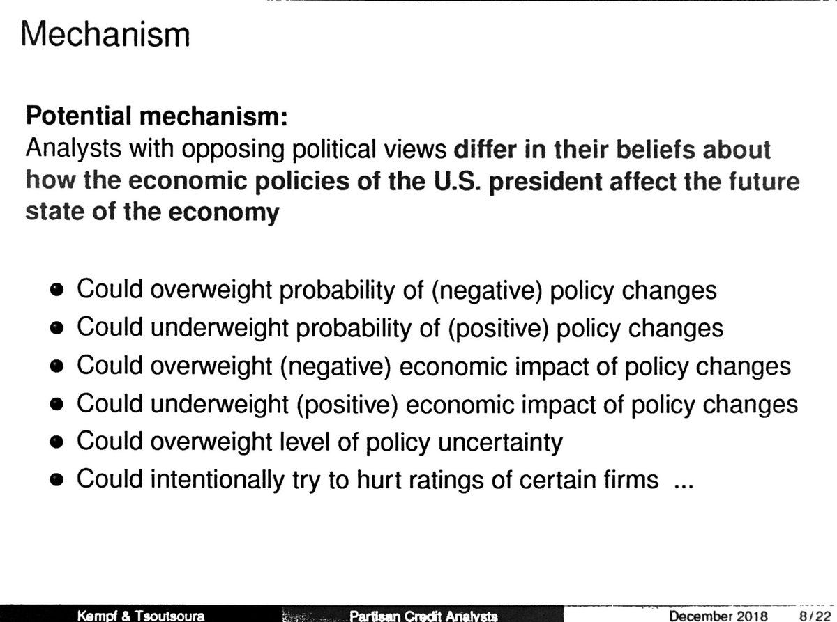 Next paper: Stefan Lewellen presents/discusses Elizabeth Kempf and Margarita Tsoutsoura, “Partisan Professionals: Evidence From Credit Ratings Analysts.” Paper assesses whether individual partisan beliefs affect professional credit analysts’ ratings. ※ YES #FRA2019