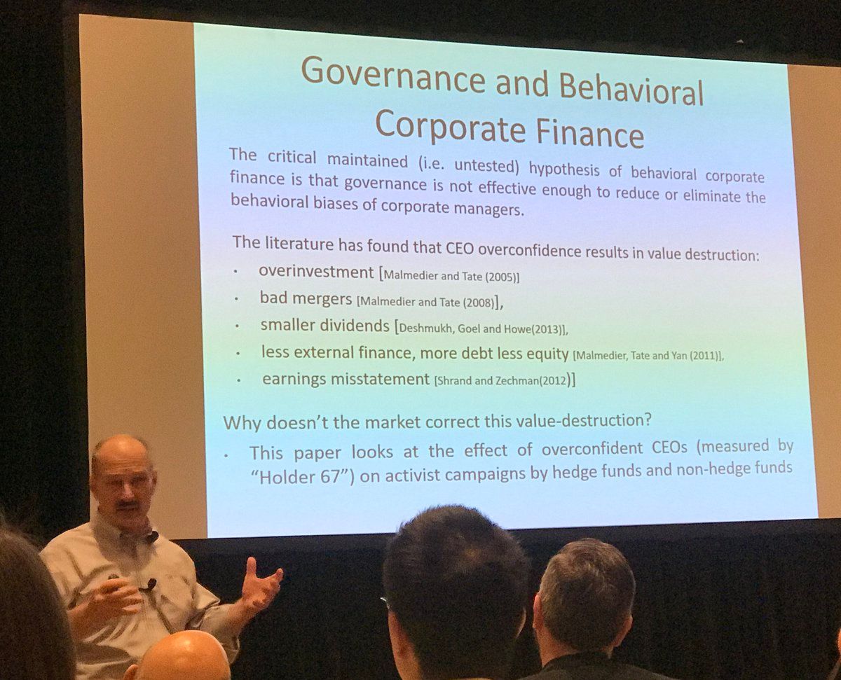 #FRA2018 “Early Ideas” session number four: @ctrzcinka (with Abhi Ganguli) asks “Do Activist Hedge Funds Avoid Overconfident Managers?” Why doesn’t market correct value destruction from overconfident CEOs?
