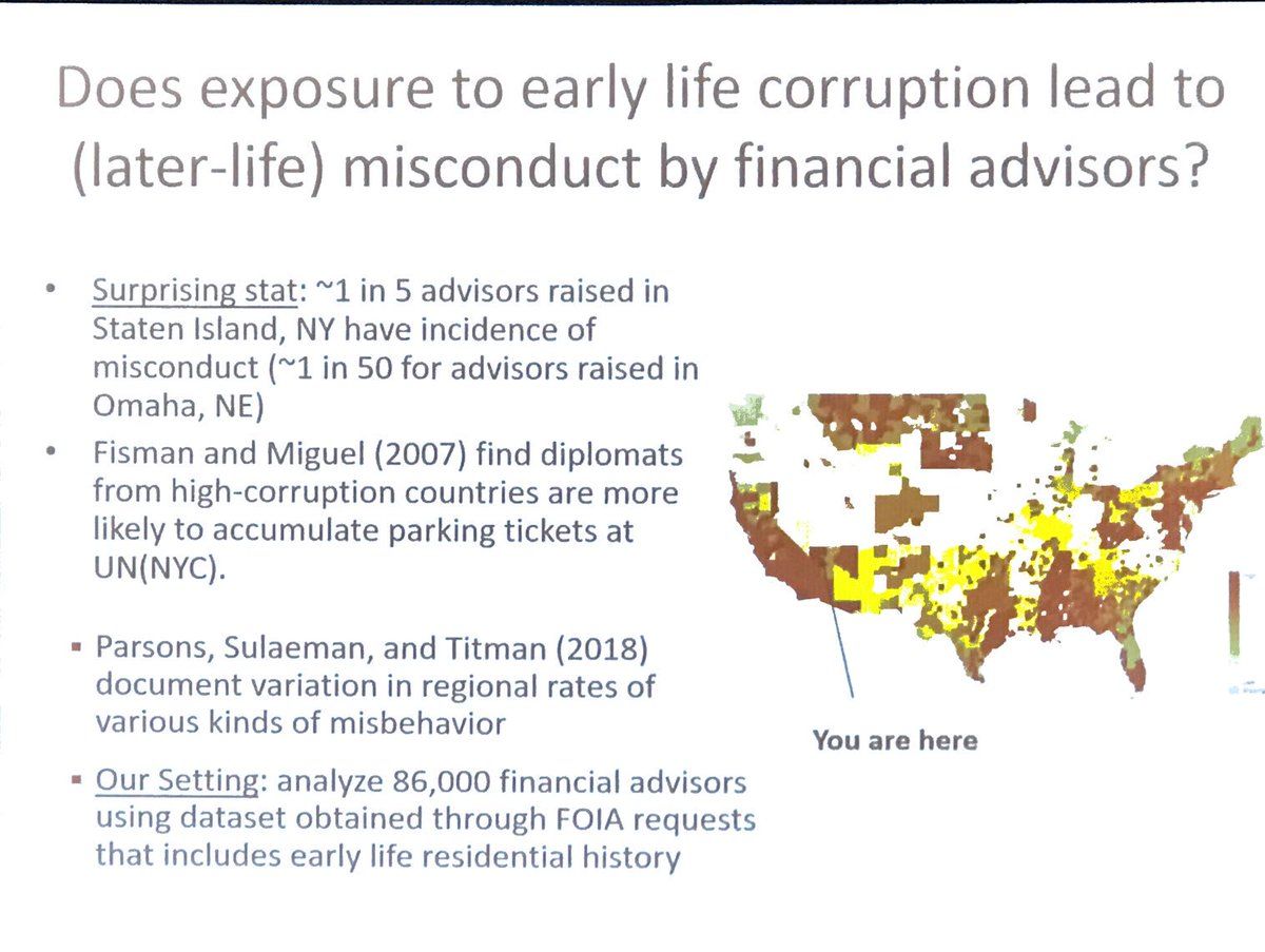 Next up, Will Gerken (@universityofky) and coauthors with an idea titled “Born to be Bad.” Turns out that where a financial advisor grew up is highly associated with subsequent rates of misconduct. See pic for a summary stat about Staten Island! #FRA2018