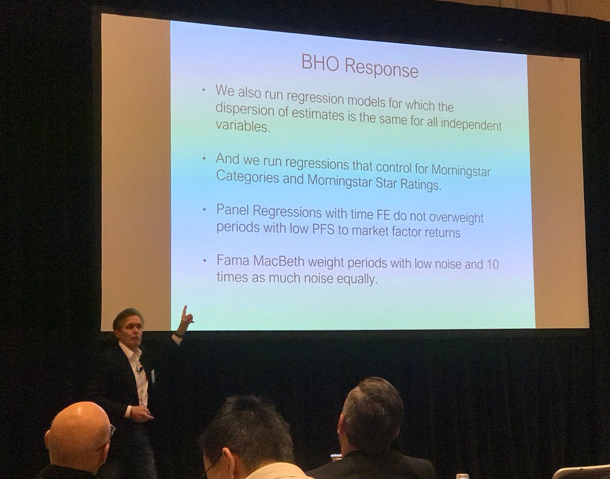 BLRS ask: What informatin do mutual fund investors pay attention to? 1. Morningstar ratings 2. Do not discount market factor returns 3. BHO’s results are driven by methodological error Odean (i.e., the “O” in BHO) doesn’t seem to agree with 2 or 3 #FRA2018