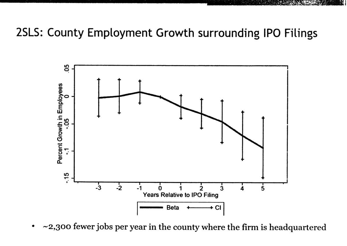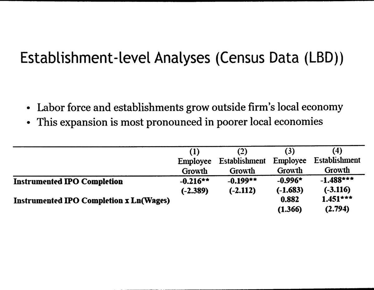 Empirics: Using sample of county-years with ≥1 IPO filing, compare completed and withdrawn IPOs (using Shai Bernstein instrument for IPO success). CGKP find: IPOs have *negative* impact on headquarters county employment, population, and wage growth. cc: @JasonKotter #FRA2019