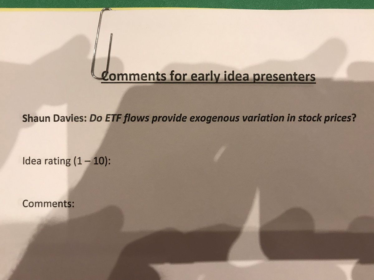 First up: Shaun Davies on an idea about whether ETF flows provide exogenous variation in stock prices? Lots of papers rely on asset market externalities to identify causation (e.g., in CF). ETF flows generate price distortions in underlyings. (More $ in ETFs than HF!) #FRA2018