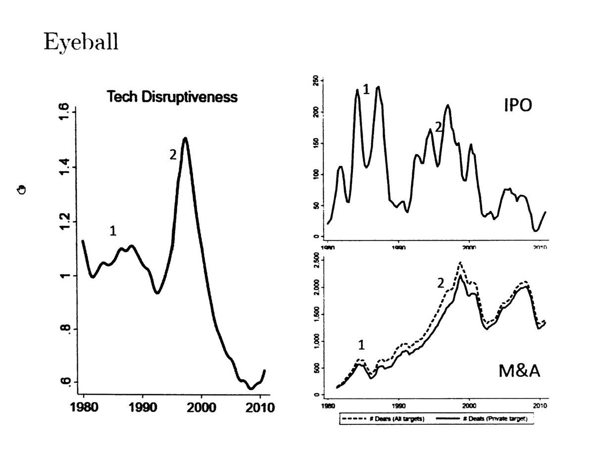 Paper connects 1. Technology (new text-based measure of technology disruptiveness) 2. Firms/IO (new mechanism suggesting firms with more disruptive tech more likely to IPO) 3. Growth (interaction of trends in tech and capital markets) #FRA2019