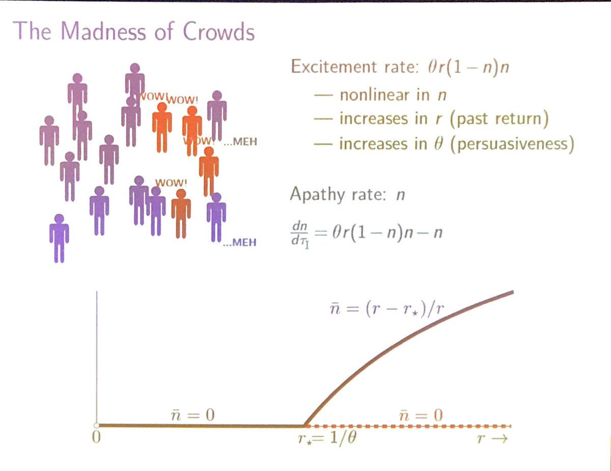 Equilibrium bubbles (price ≠ value) arise when returns exceed threshold determined by persuasiveness: r* = 1/𝜃. Empirics: Regress bubble (explosive growth followed by immediate crash) on persuasiveness (covariance between media coverage and previous month’s return) #FRA2019