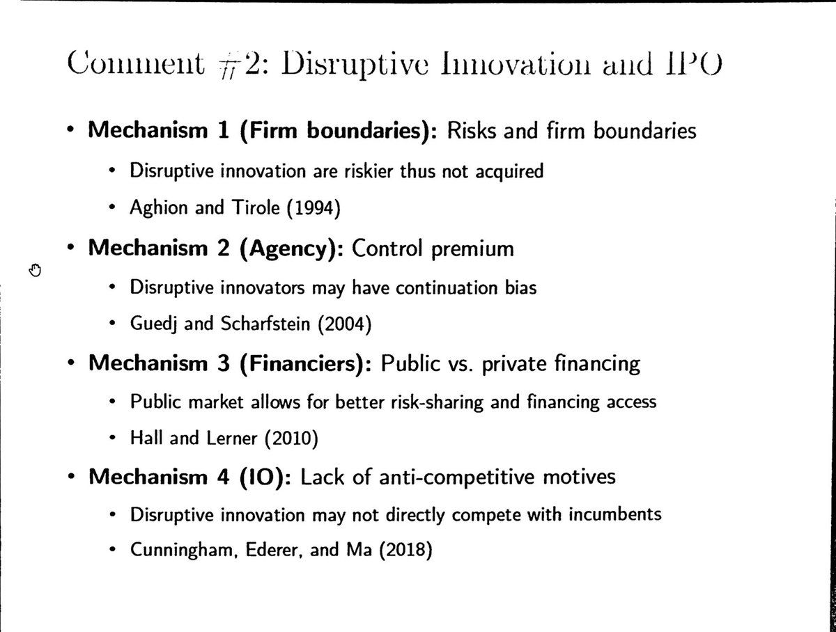 BFH estimate competing risk hazard model (and OLS) to predict IPO and sell-out using the patent-based “tech disruptiveness” measure. ※ More disruptive tech. correlates with IPOs @ProfSongMa notes: Lots of potential mechanisms! (See pic) #FRA2019