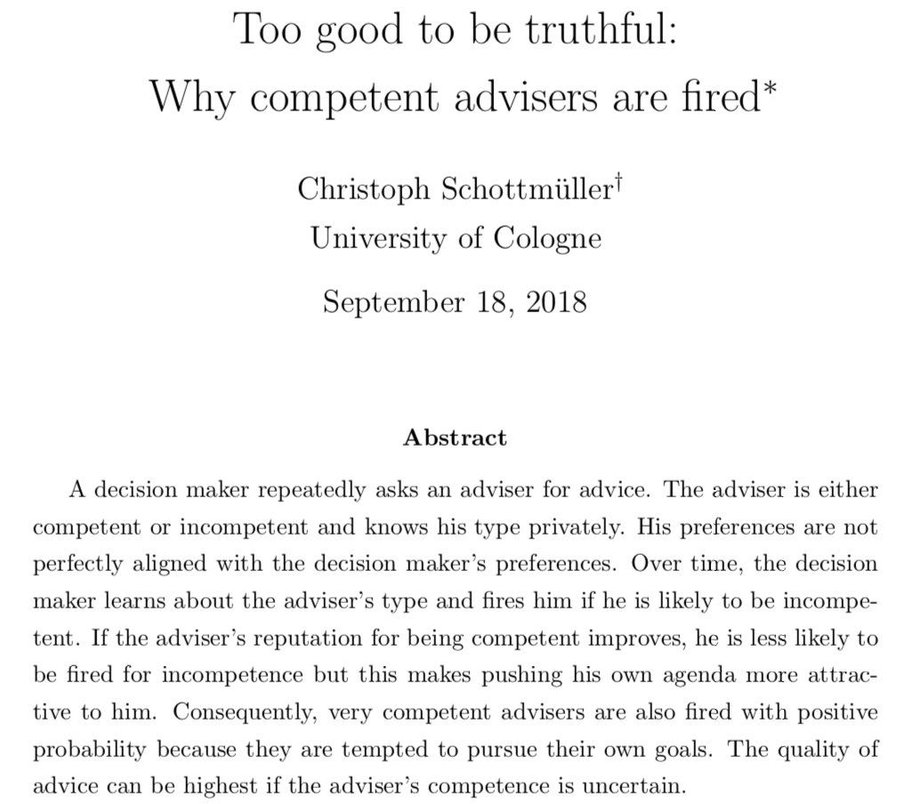 Crossed my desk today and seemed… apropos? “Too good to be truthful: Why competent advisers are fired” by Christoph Schottmuller