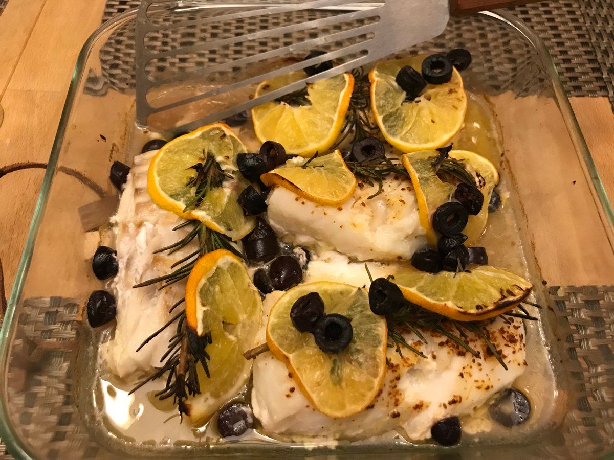 Fish from the freezer Olives from the fridge Rosemary and lemons from the garden