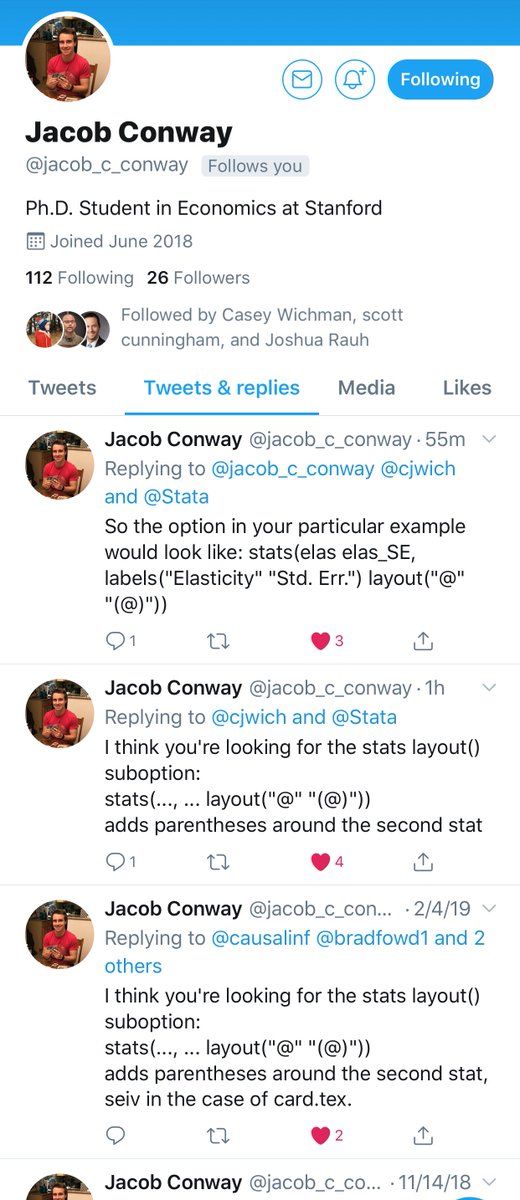 .@jacob_c_conway is an -esttab- genius whose Tweets are amazingly consistently on-brand. 😉 If you need “stats(… layout(…))” advice, seek out no other source.