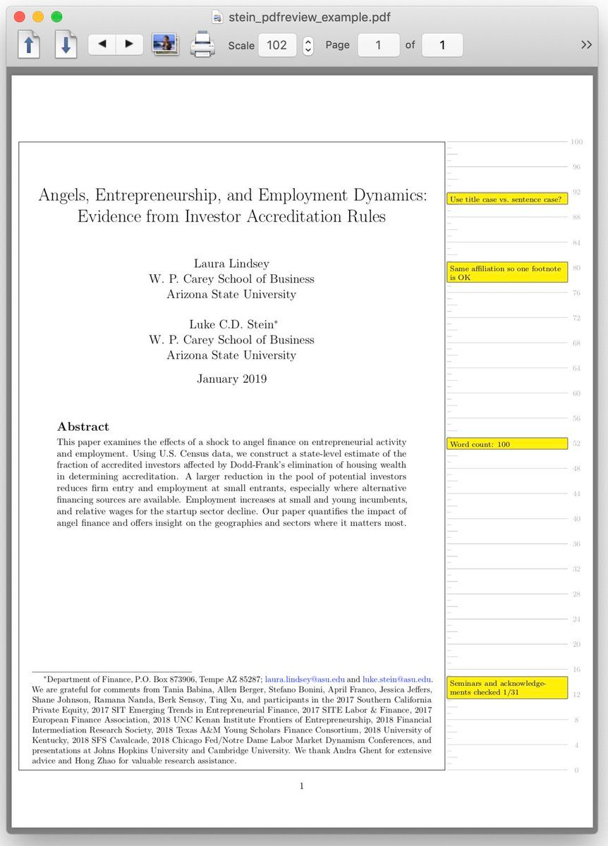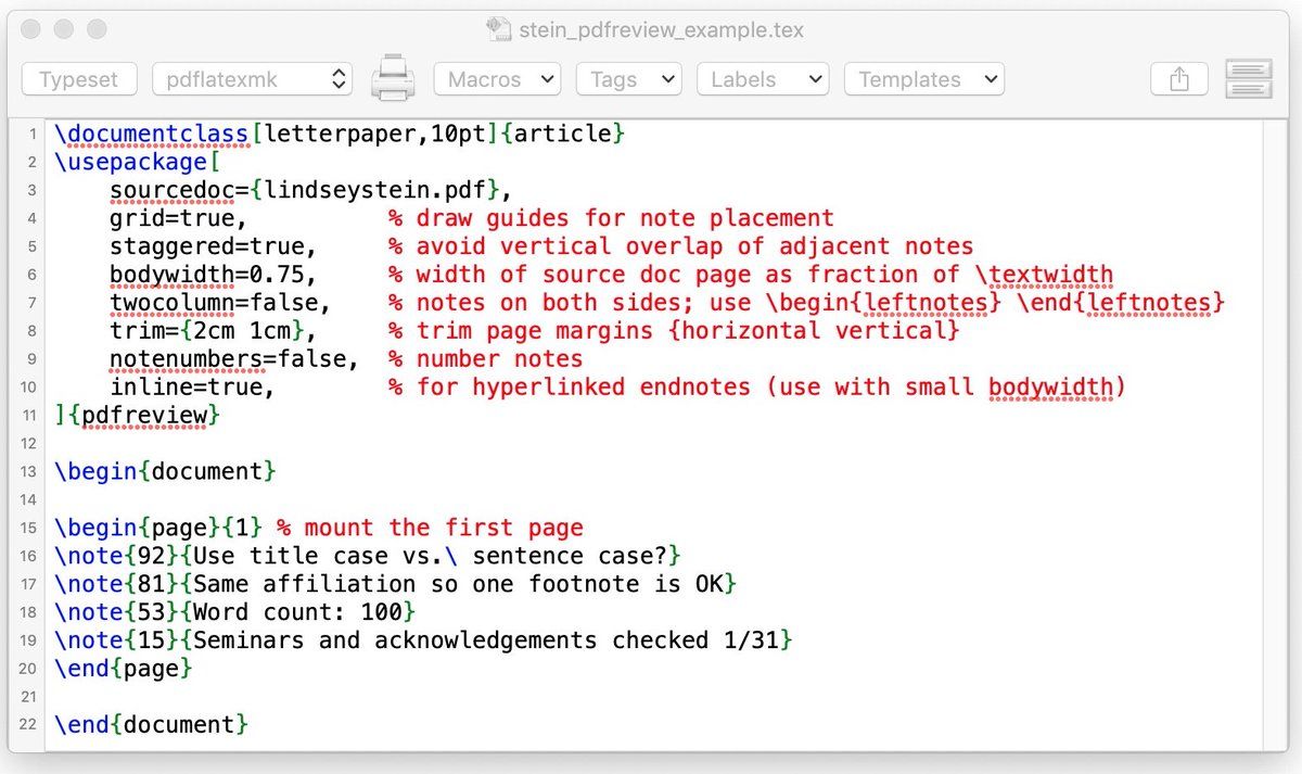 Do you ever need to give comments or suggest edits on PDF files? I do, and suggest the awesome pdfreview package for #LaTeX. Easy to write and—unlike Acrobat (or similar) annotations—print.
