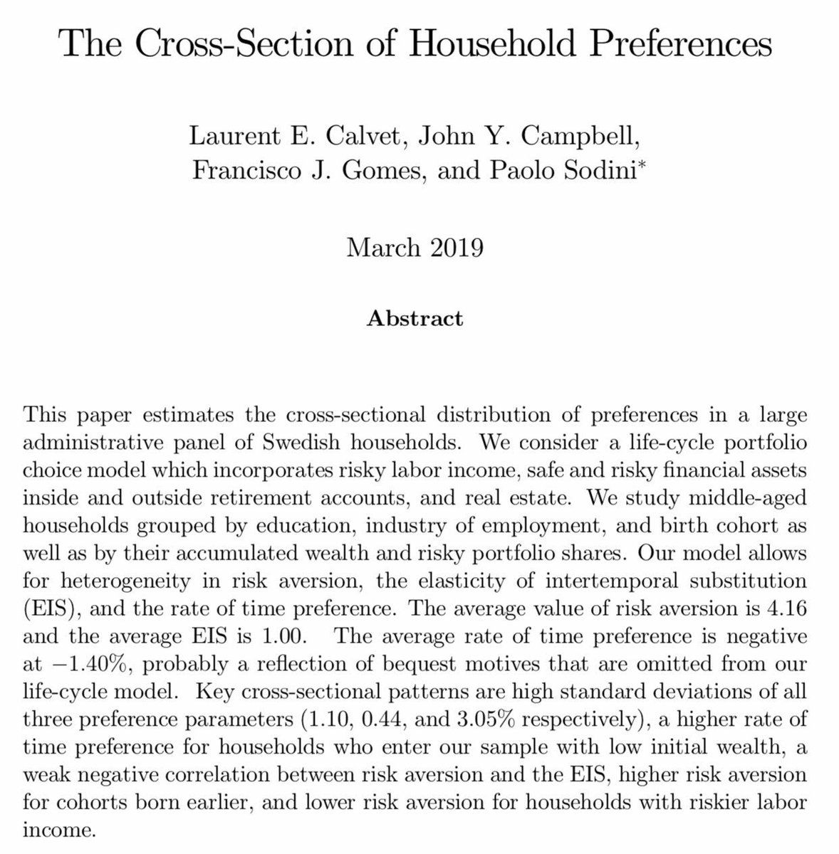 @daniel_egan @arpitrage @BillWinterberg @MichaelKitces Not sure it qualifies as a practical implementation, but is very interesting. Basic approach of the paper is to use observed portfolios (assumed optimal) and education/industry/age to back out preference parameters: risk aversion, time preference, and IES. wpcarey.asu.edu/sites/default/files/john_campbell_seminar_paper_march_29_2019.pdf