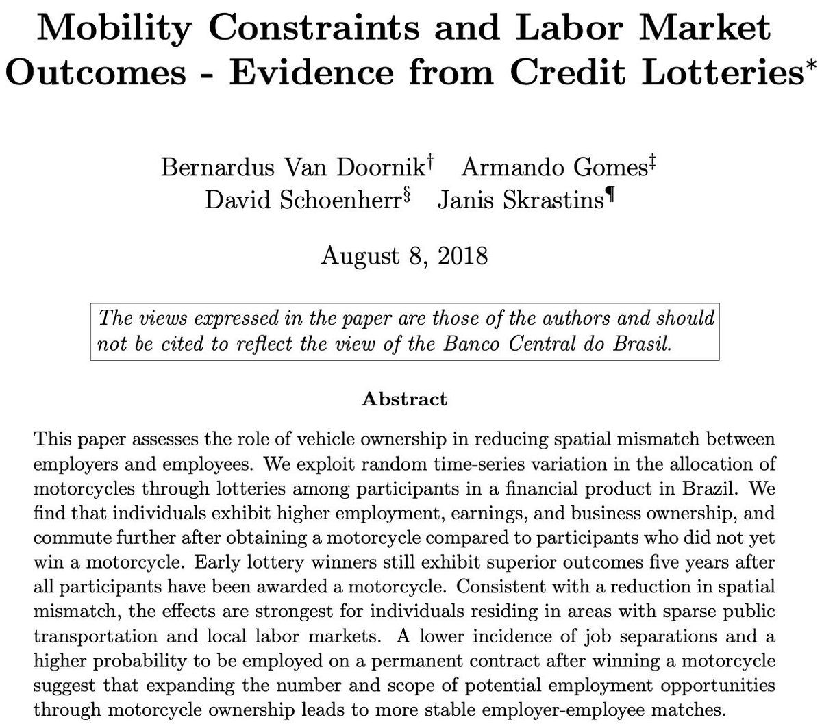 PAPER 10/10: “Mobility Constraints and Labor Market Outcomes: Evidence from Credit Lotteries” @JanisSkrastins with Bernardus Van Doornik (Banco Central do Brasil), Armando Gomes (@WUSTLbusiness), and David Schoenherr (Princeton) 💰🇧🇷 🏍🛵🏍🛵 🇧🇷💰 #NUfin2019