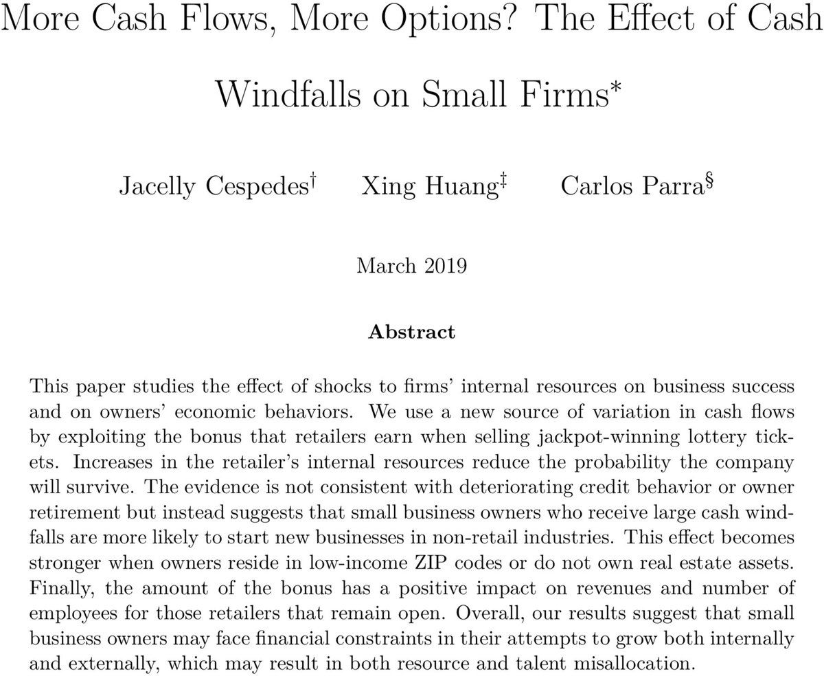 PAPER 4: “More Cash Flows, More Options? The Effect of Cash Windfalls on Small Firms” by Jacelly Cespedes (@CarlsonNews) with Xing Huang (@WUSTLbusiness) and Carlos Parra (@ucatolica) @arpitrage did a nice thread on this paper a few weeks ago. @arpitrage/1121798183640813568 #NUfin2019