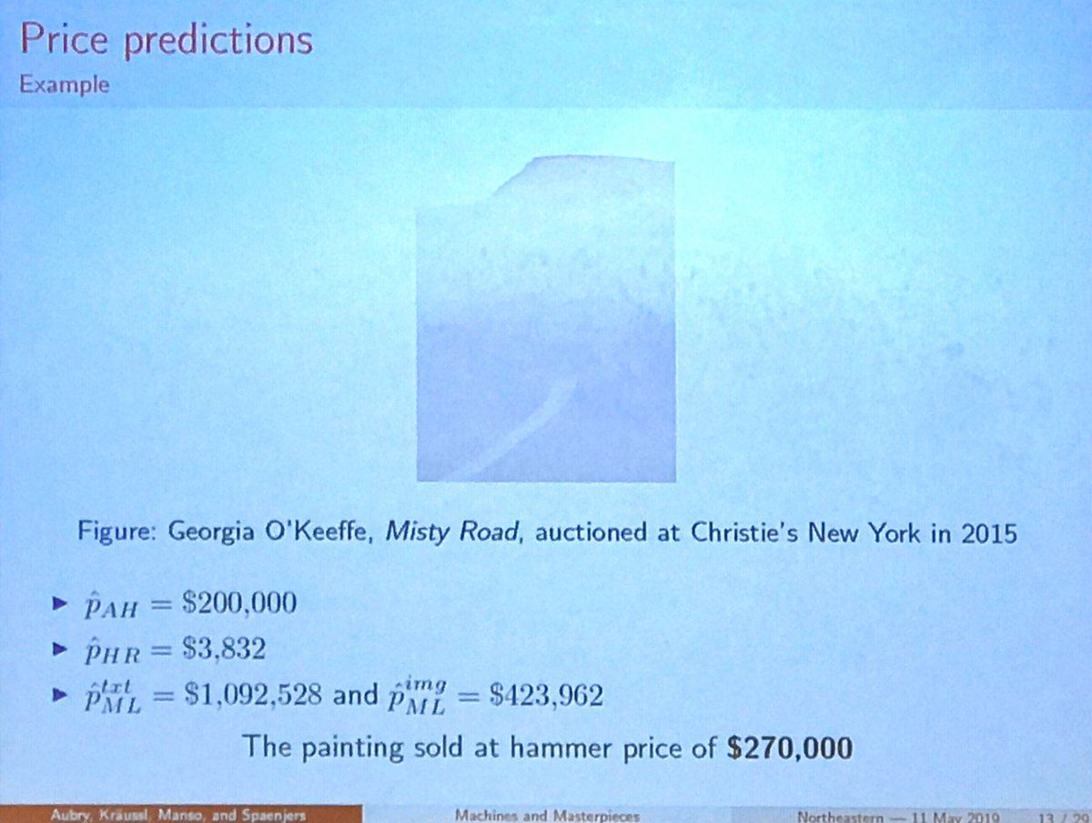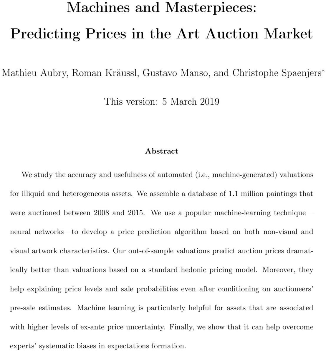 PAPER 7: “Machines and Masterpieces: Predicting Prices in the Art Auction Market” by @CSpaenjers with Mathieu Aubry (@EcoledesPonts computer vision scientist), @RomanKraussl, and Gustavo Manso (@BerkeleyHaas) Looks at machine learning and automated valuation methods #NUfin2019