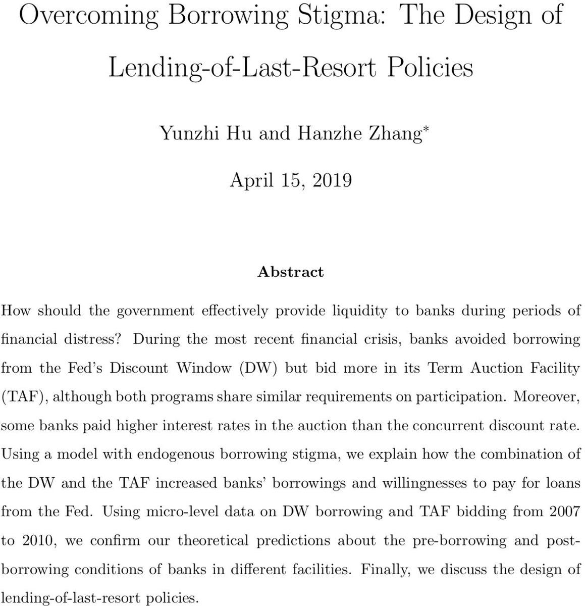 PAPER 1: “Overcoming Borrowing Stigma: The Design of Lending-of-last-resort Policies” by Yunzhi Hu (@kenanflagler) with Hanzhe Zhang (@MSUBroadCollege). Model of discount window stigma and the term-auction facility, with confirmatory empirical evidence. #NUfin2019