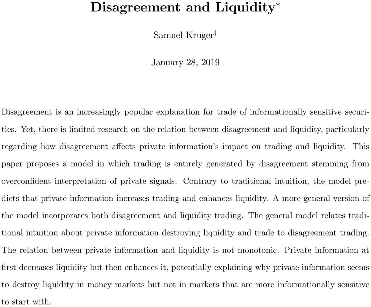 PAPER 2: “Disagreement and Liquidity” by Samuel Kruger @UTexasMcCombs Model (≈Grossman ’76+overconfidence)→ -Trade entirely overconfident disagreement? Private info inc. trade and liquidity. -Some trade from liquidity shocks? Liquidity non-monotone in private info. #NUfin2019