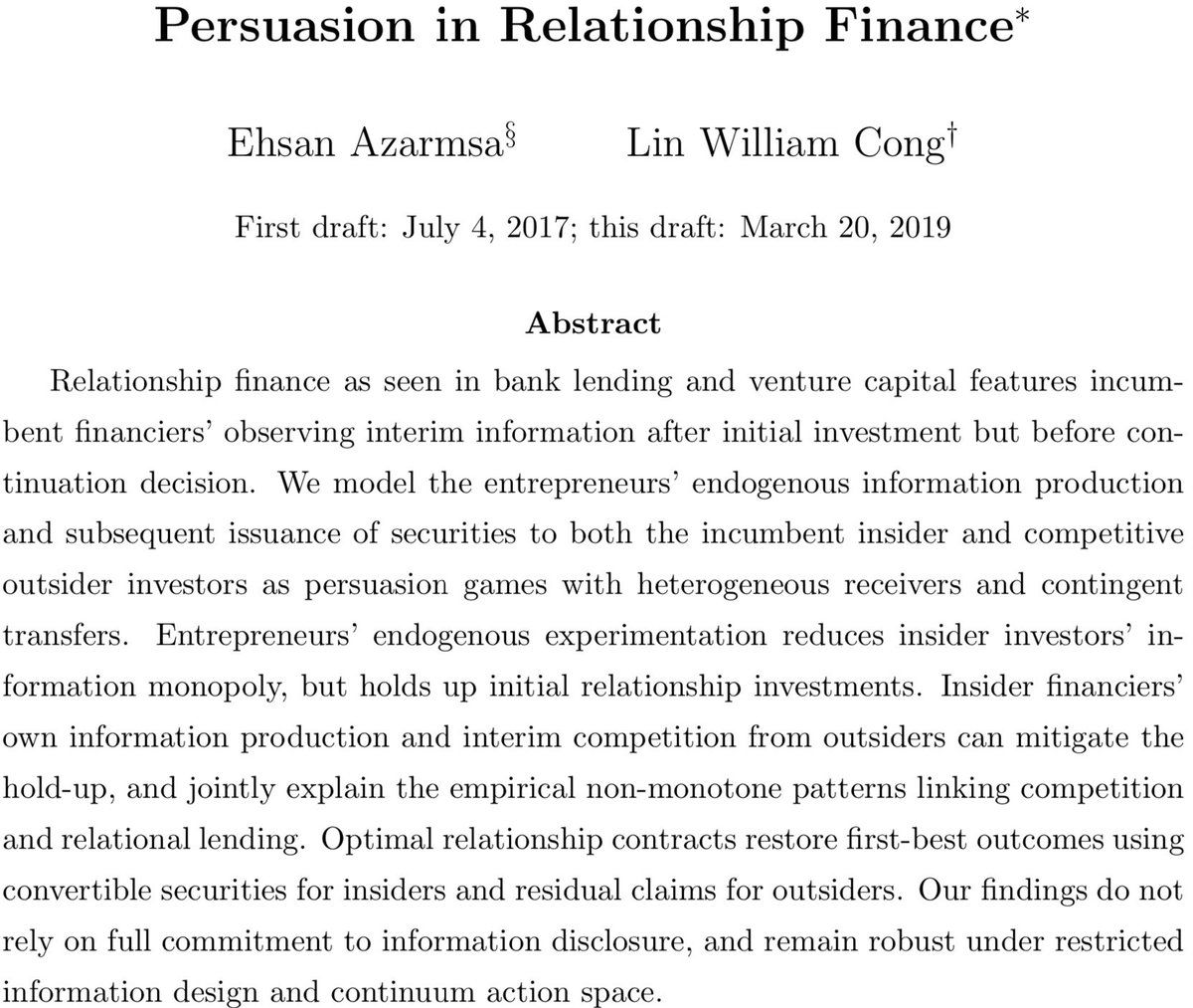 PAPER 3: “Persuasion in Relationship Finance” by Ehsan Azarmsa with Lin William Cong (both @ChicagoBooth) and Uday Rajan (@MichiganRoss). How should entrepreneurs finance experimentation? Model of staged financing with imperfect competition between potential funders. #NUfin2019