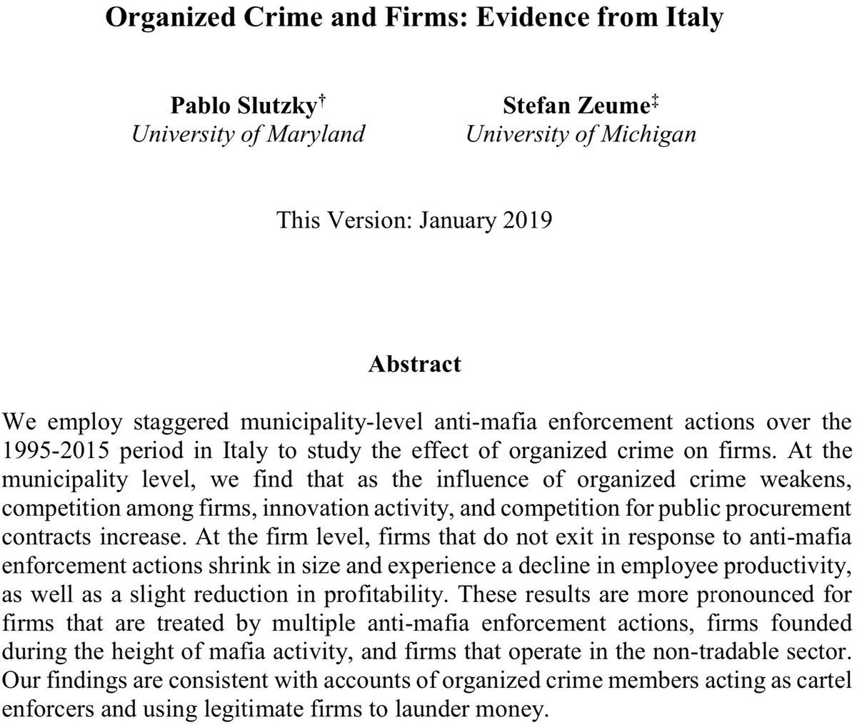 PAPER 8: “Organized Crime and Firms: Evidence from Italy” by Pablo Slutzky @SmithSchool with Stefan Zeume @MichiganRoss Another paper I've seen before, have tweeted before, and love. Authors have a broader set of cool crime+finance papers, too. #NUfin2019 @lukestein/1099365700701835264