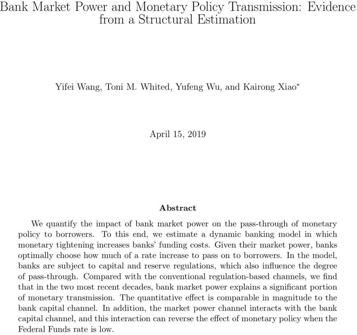 PAPER 5: “Bank Market Power and Monetary Policy Transmission: Evidence from a Structural Estimation” by Yufeng Wu (@giesbusiness) w Yifei Wang (@MichiganRoss), @toniwhited, @kairong_xiao Banks’ market power creates imperfect pass through of rate changes to depositors. #NUfin2019