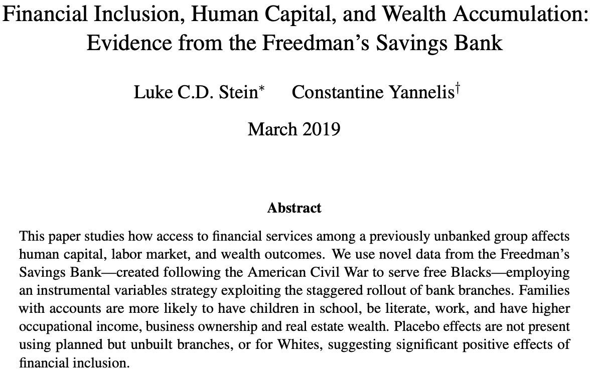 PAPER 9: My presentation (can’t tweet): “Financial Inclusion, Human Capital, and Wealth Accumulation: Evidence from the Freedman’s Savings Bank” (w Constantine Yannelis @ChicagoBooth) Excited for discussion from Charles Hadlock @MSUBroadCollege #NUfin2019 ssrn.com/abstract=3302996