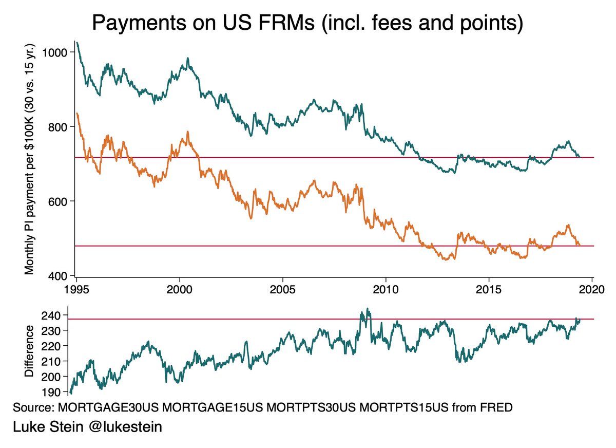 Feel free to play along at home (e.g., cc: @daniel_egan) including to tell me if/why I shouldn’t be using the Freddie Mac PMMS data this way (¿cc: @arpitrage?) gist.github.com/lukestein/0dca5c989705bb2d3ef8c5b45ed564a9#file-mortgage-30-vs-15-do
