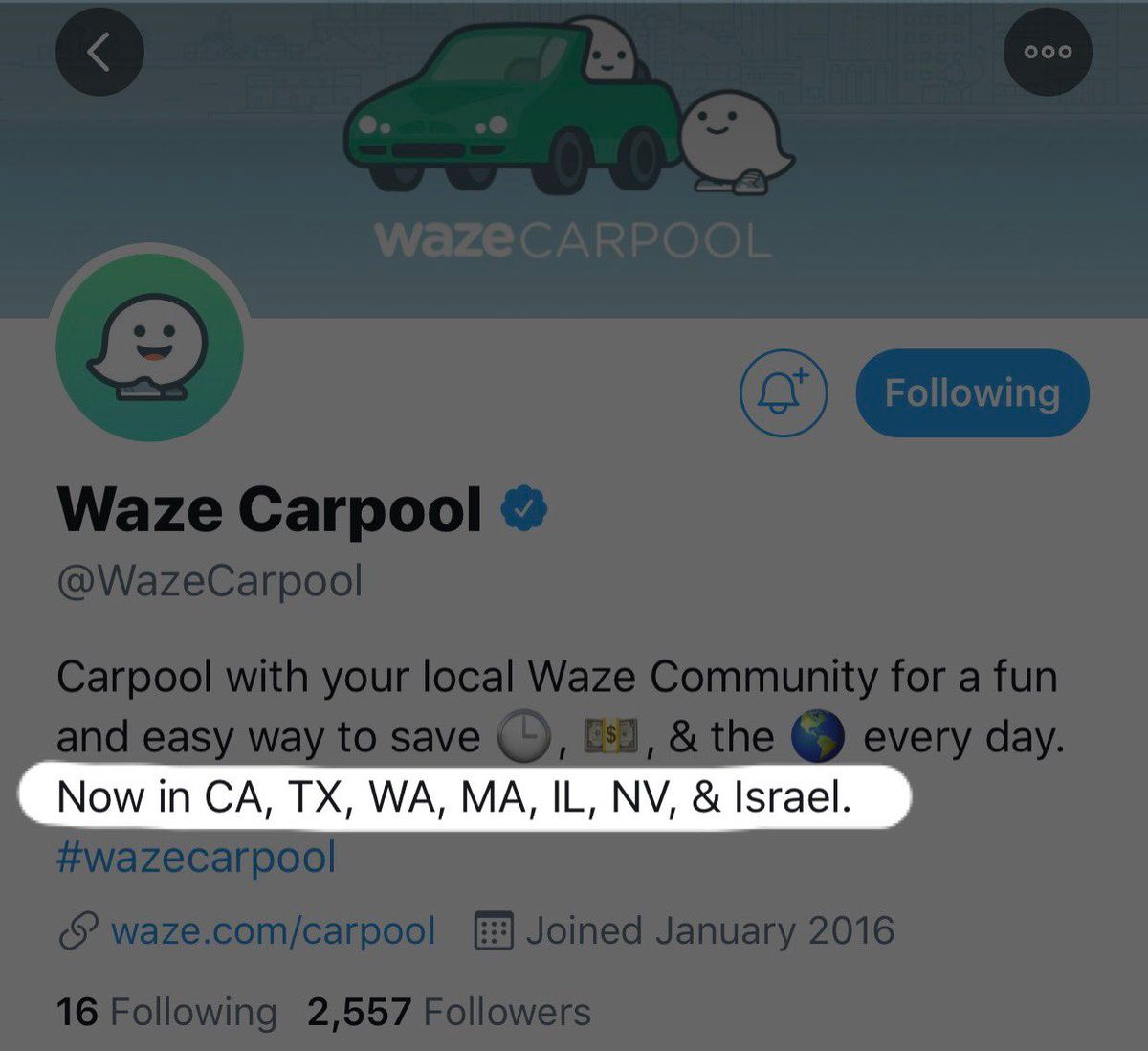 @waze Hi Waze. The @WazeCarpool Twitter account has some *old* info in its profile and hasn’t posted since 2018. More likely to attract drivers and riders if you show the world that the product team is alive and kicking!