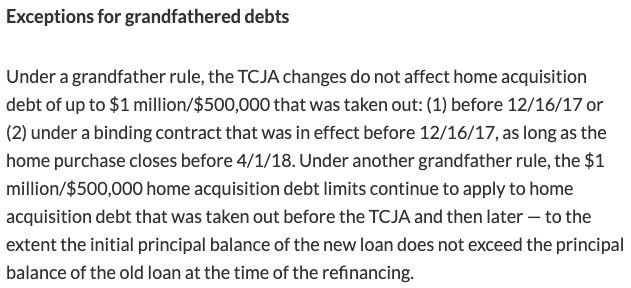 @namalhotra @nikir1 My [DISCLOSURE: IMPERFECT] understanding: as long as it’s standard refi (i.e., not cash-out), mtg int deductability grandfathered up to $1M aquisition debt. SALT cap + higher std ded mean this matters for fewer people (but of course disproportionately those with big mortgages).