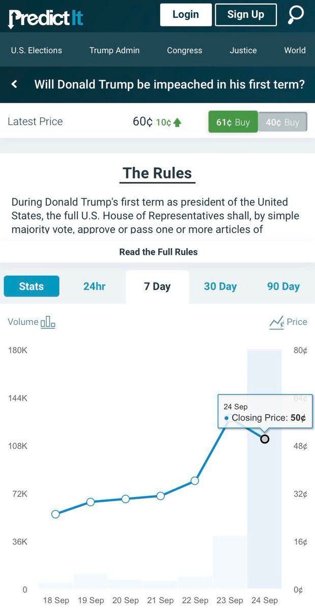 No need for a bank shot… PredictIt’s impeach contract is up from 50¢ ↗︎ 60¢ today 🤷🏻♂️