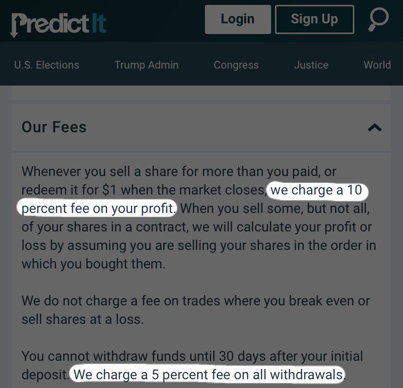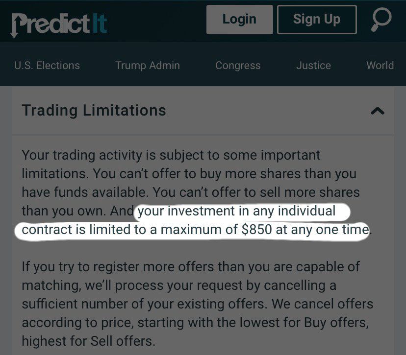 Re: limits to arbitrage on @PredictIt, suppose I thought Yang “overvalued” • Deposit $850 max • Buy Yang No’s for ≥93¢ • Best case hold-to-settle turns $850 → $850 × (1/0.93) ≈ $914 • Pay 10% of profit and 5% withdrawal fee ⇒ withdraw ~$862 $12 or 1.4% in 15 months 🤔
