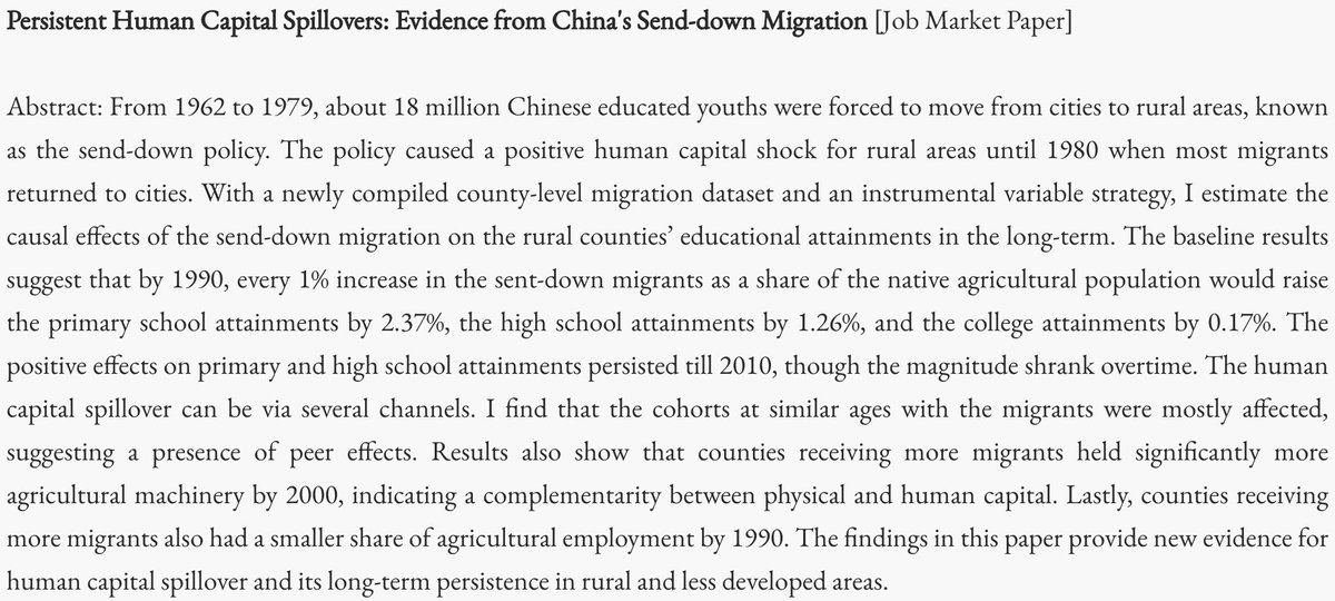 Peter Zhixian Lin is an impressive JM candidate working on labor and economic history. In addition to a cool JM paper on spillovers from Chinese urban → rural migrants, he has several other cool papers (and promised he’d post their abstracts, too!) zhixianlin.com/