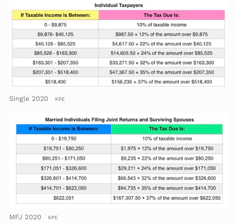 2020 federal income tax brackets announced today; cutoffs up ~1.6%. Standard deduction also up $12,200↗︎$12,400.