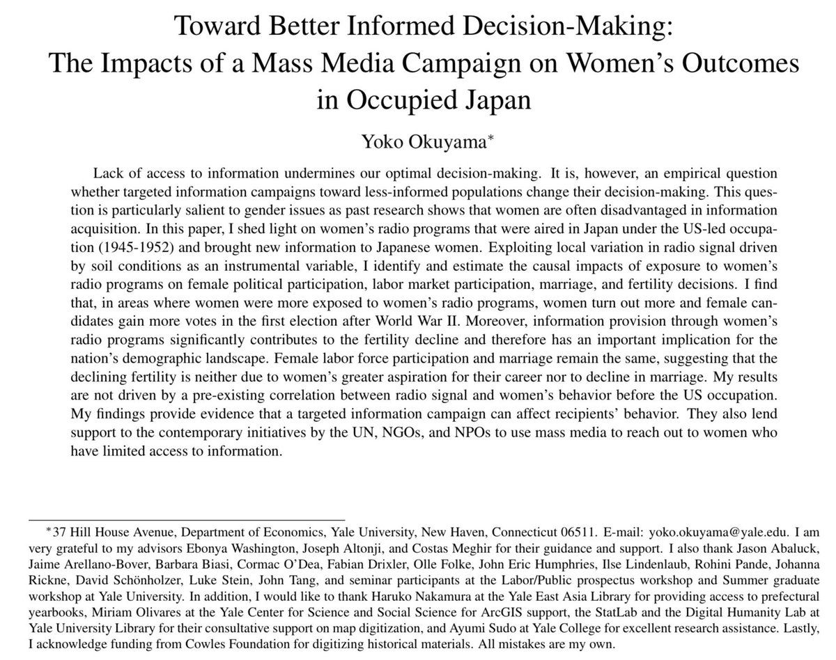 I enjoyed reading an earlier draft of Yoko’s interesting JMP💮 showing that radio programming during the US occupation of Japan affected women’s subsequent political participation, labor force participation, and family formation. New data + cool IV! @yoko_okuyama/1194469889005834240