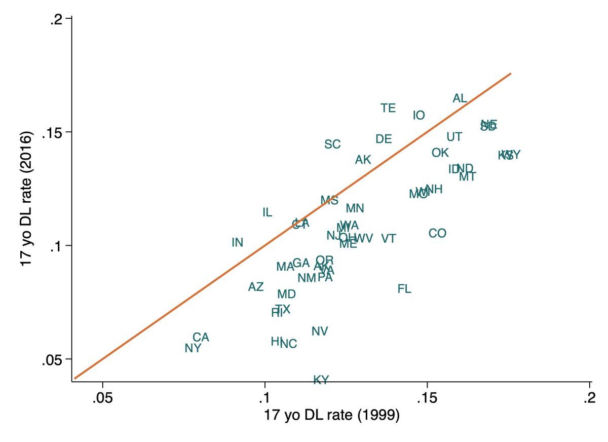 @paulgp I always have a hard time making heads or tails of those graphs (and I’m a Stata “mlab(•) mlabpos(0) m(i)” fanboi) so here’s a scatter version. Also, just PRed the Stata data to your github repo in case someone else wants to play with it.