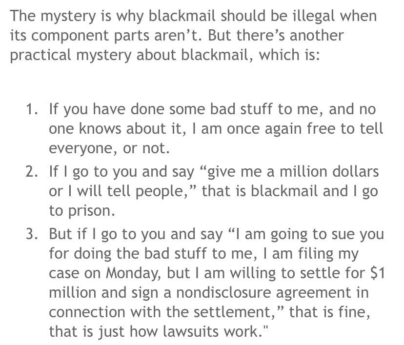 Al Roth (citing/channeling @matt_levine) asks whether/why blackmail is a repugnant transaction, but negotiated legal settlements with NDAs aren’t marketdesigner.blogspot.com/2019/12/sex-lies-videotape-andblackmail.html