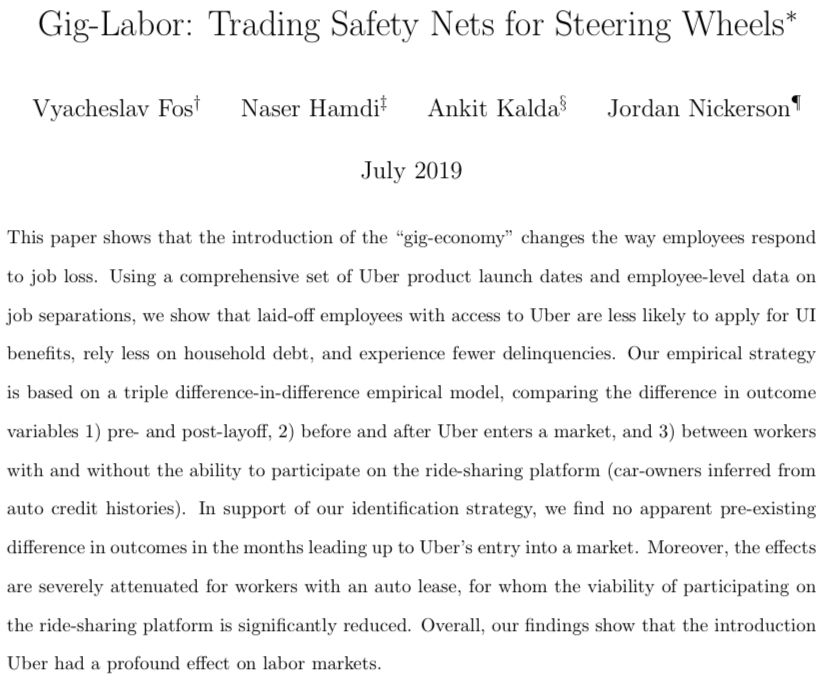 PAPER 6: “Gig Labor: Trading Safety Nets for Training Wheels” by Fos, Hamdi, Kalda, and Nickerson; presented by Isaac Hacamo. Paper finds that the possibility of driving for @Uber helps insure workers against adverse consequences of layoffs. #FRA20