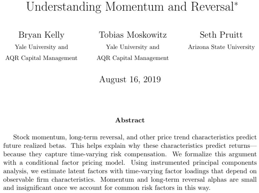 Conclusion: “Momentum and long-term reversals… [are] explained by conditional betas in a no-arbitrage factor model” [Andrei notes that “Factor 3” from authors’ IPCA paper is ~0.5 correlated with momentum.] #FRA20