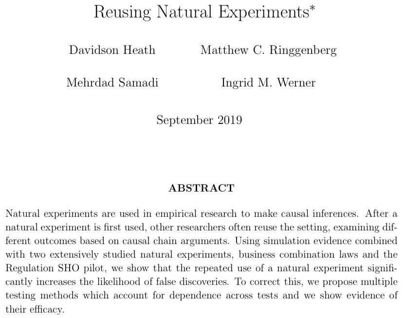 PAPER 3: @davidsontheath, Samadi, Ringgenberg, and Werner’s “Reusing Natural Experiments” is presented by Sophie Shive at @NDBusiness. Excited to see this presented; I learned that “My relevance condition is your exclusion restrictino violation.” @dlmillimet/1124331940050558979 #FRA20