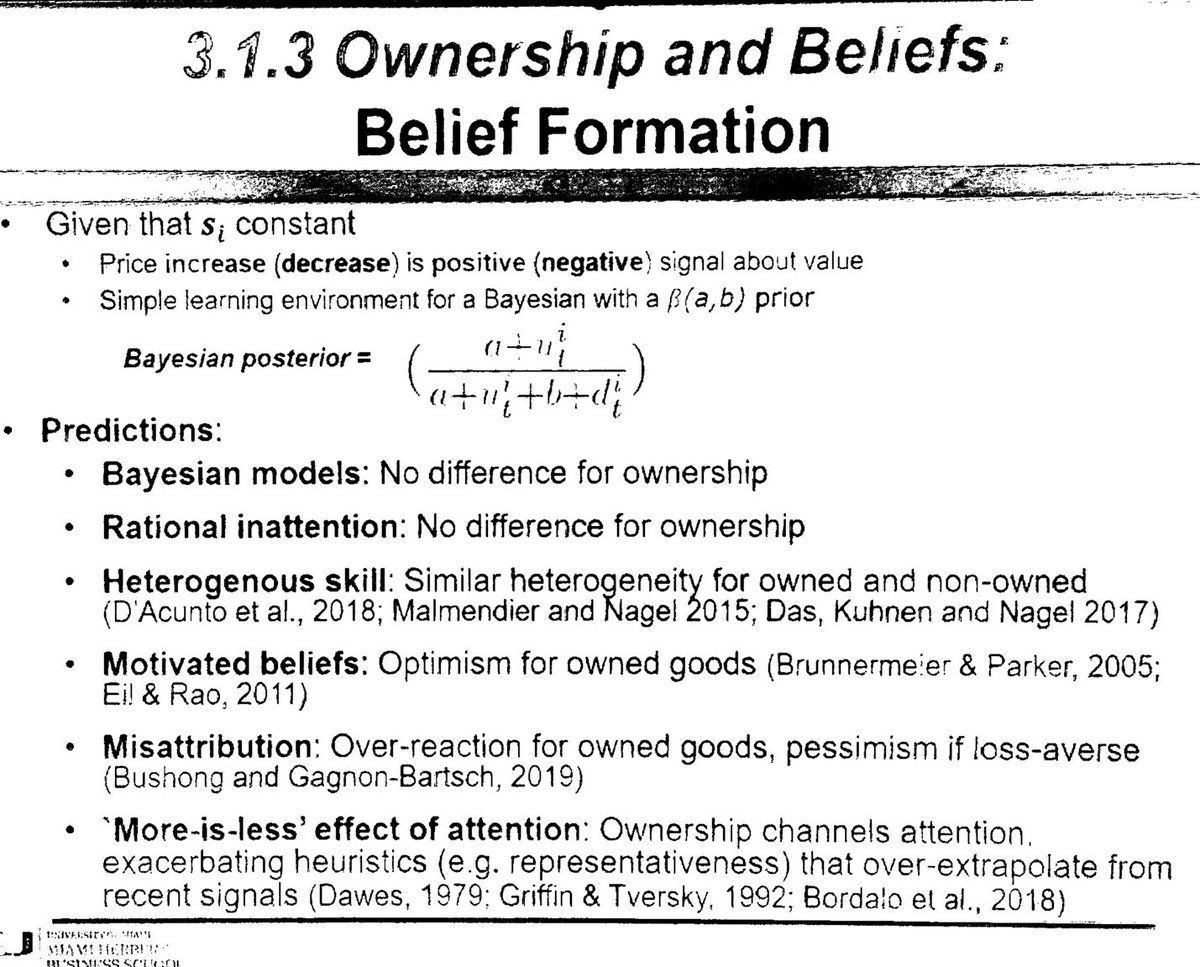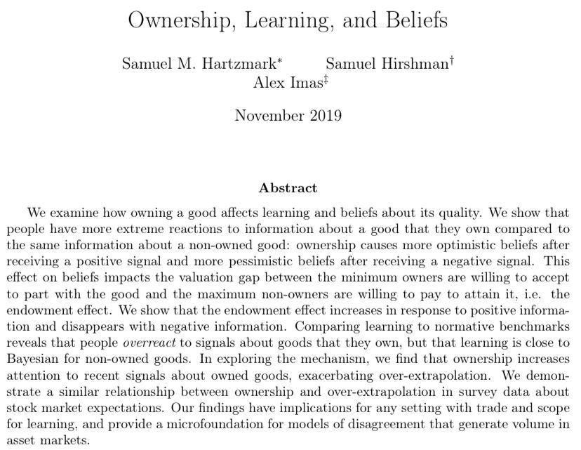 Find - Ownership leads to overreaction to informational signals (first paper looking at EE’s dynamics) - Learning is close to Bayesian for non-owners - Driven by attention: “Attention + Incorrect Mental Model = BAD” - Survey evidence consistent with experiments and theory #FRA20