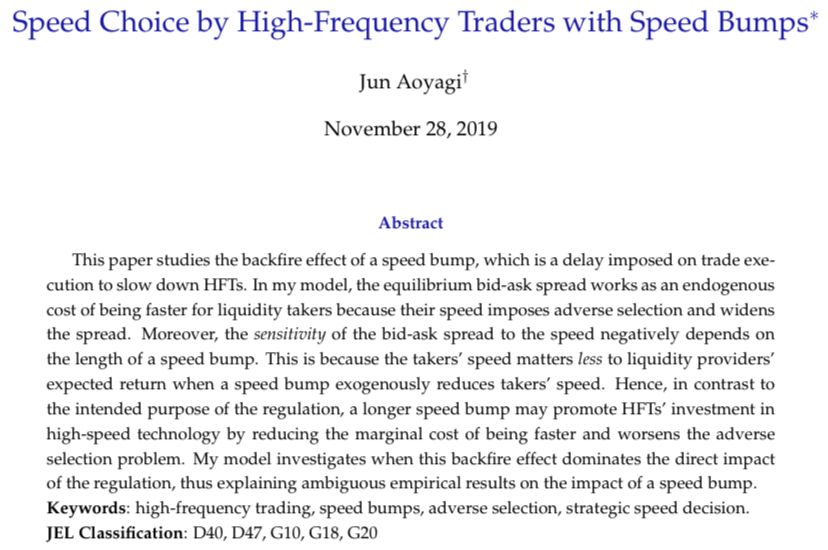 PAPER 4: Ohad Karan presents Jun Aoyagi’s “Speed Choice by High-Frequency Traders With Speed Bumps.” Note Jun is a pre-market Econ PhD student at Berkeley, with (another paper) solo-authored R&R at JET. sites.google.com/site/junaoyagi19900505/ #FRA20