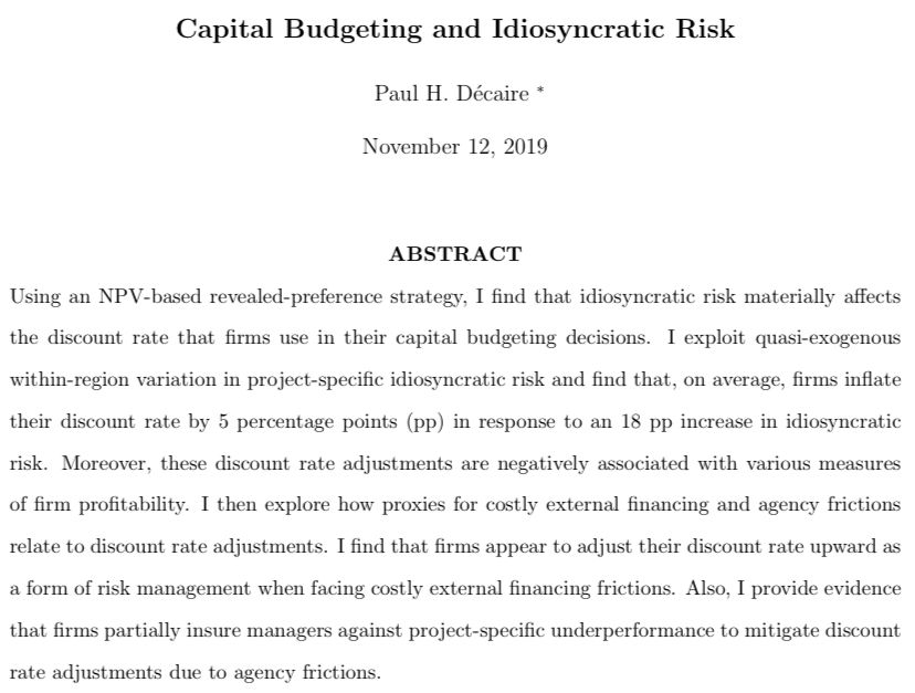 PAPER 2. James Weston presents 🚨Wharton JMC🚨 Paul Décaire’s “Capital Budgeting and Idiosyncratic Risk.” paulhdecaire.com Do managers pad their discount rates? YES Is it a big deal? NOT CLEAR Cost of capital = Rf + 𝛽×MRP + stuff? #FRA20