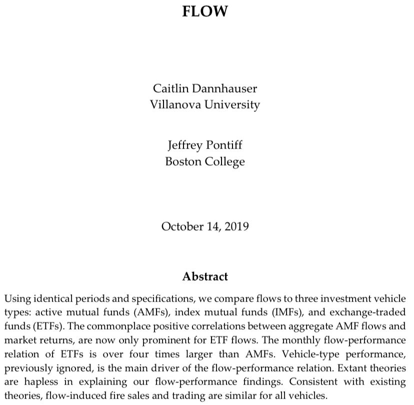 .@csialm has some suggestions and also summarizes: - Strong index fund/ETF flow-perform. relationship puzzling if flows driven by rational invesors rewarding skill - Differences btwn passsive MF vs. active MF vs. ETF partly explained by institutional differences. (Theory?) #FRA20