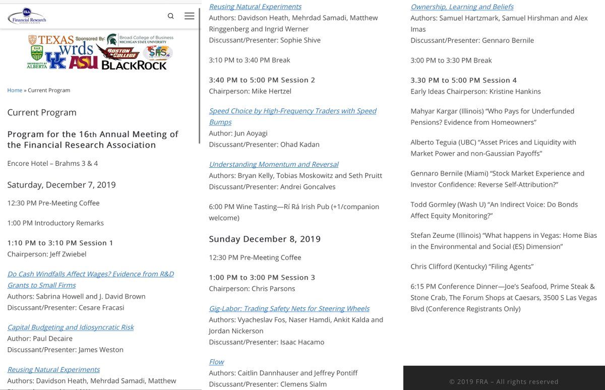 Heading in to our first session at the 2020 Financial Reaearch Association conference; live-tweet starts now. (If you’re not interested, please 48-hour mute hashtag #FRA20 ). Program with paper links is here: fraconference.com/current-program/
