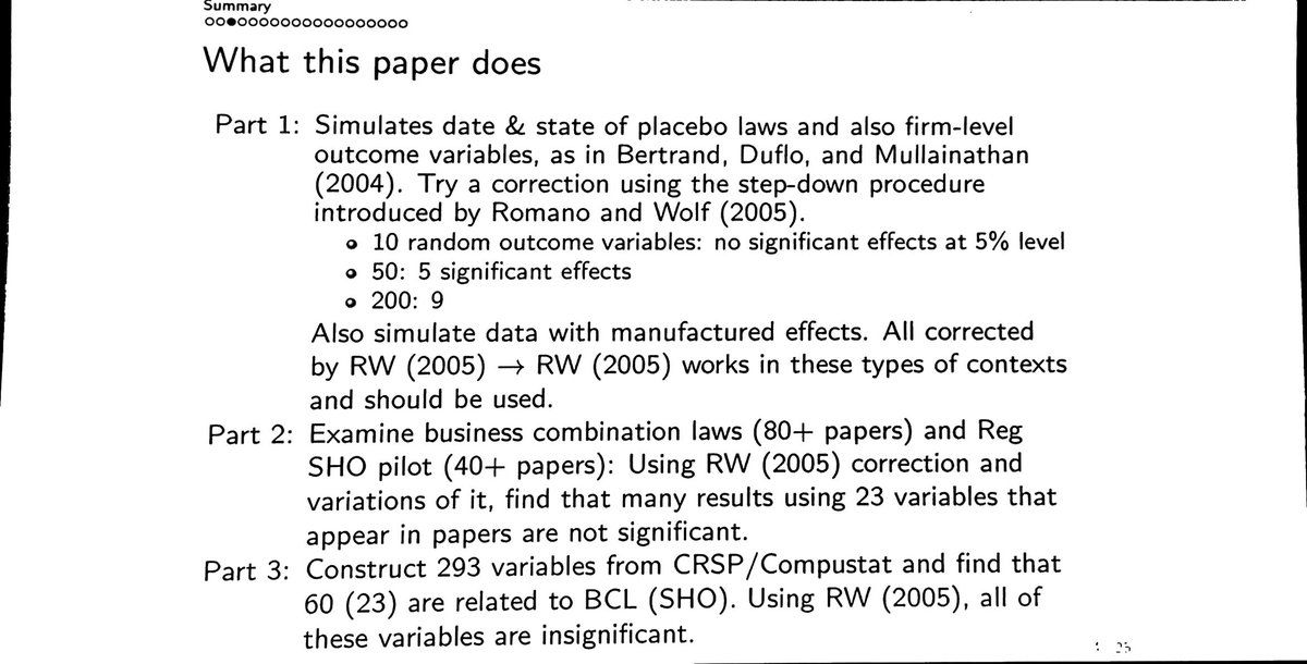 Issue is lots of papers using same natural experiments to examine different outcomes. HSRW show that Romano and Wolf (Econometrica 2005 onlinelibrary.wiley.com/doi/pdf/10.1111/j.1468-0262.2005.00615.x) correction works in simulated data. #FRA20